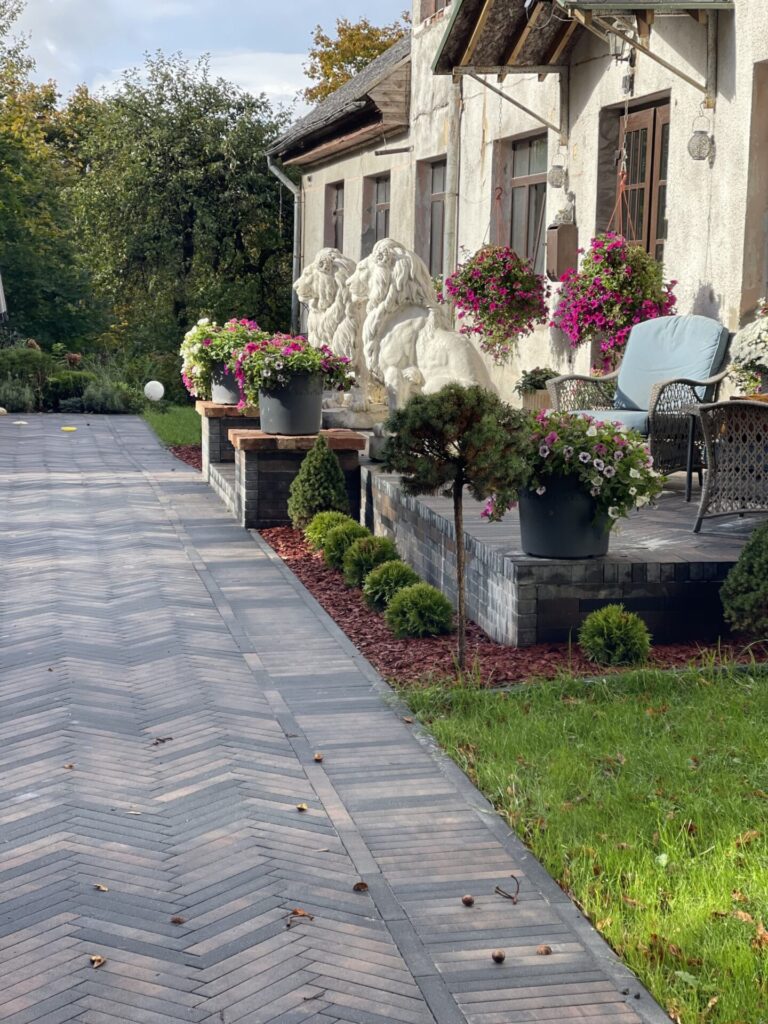 Pagalmā ieklāts Brikers Barons 360 Comfort Copper bruģis kombinācijā ar Kerbstone 8 Black apmalēm, kas lieliski pielāgojas ēkas arhitektūrai un apkārtējās vides noskaņai.
